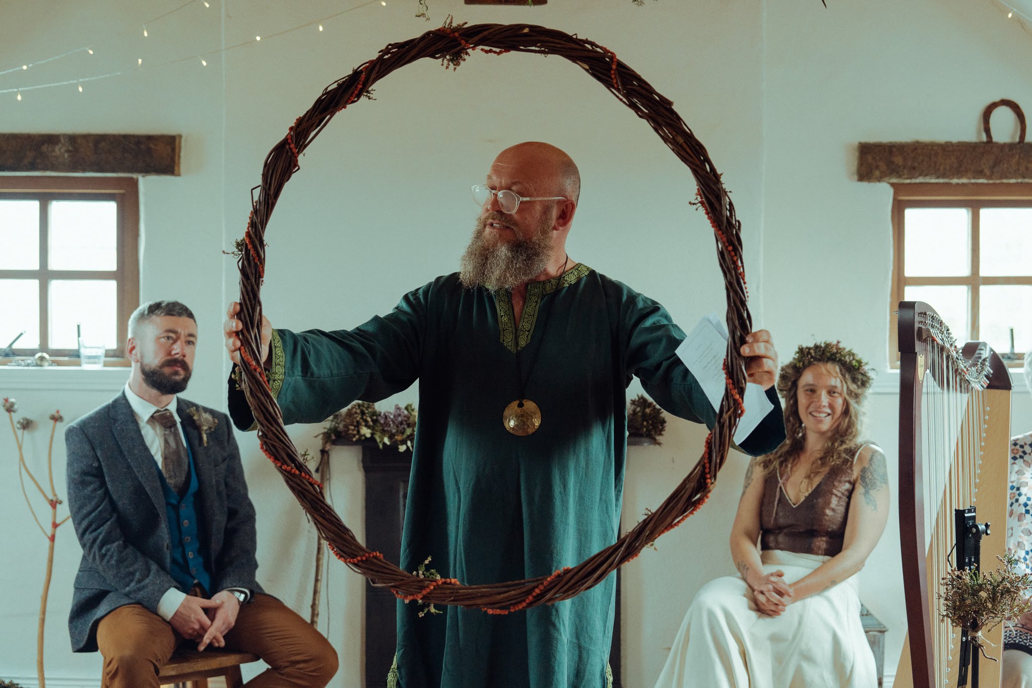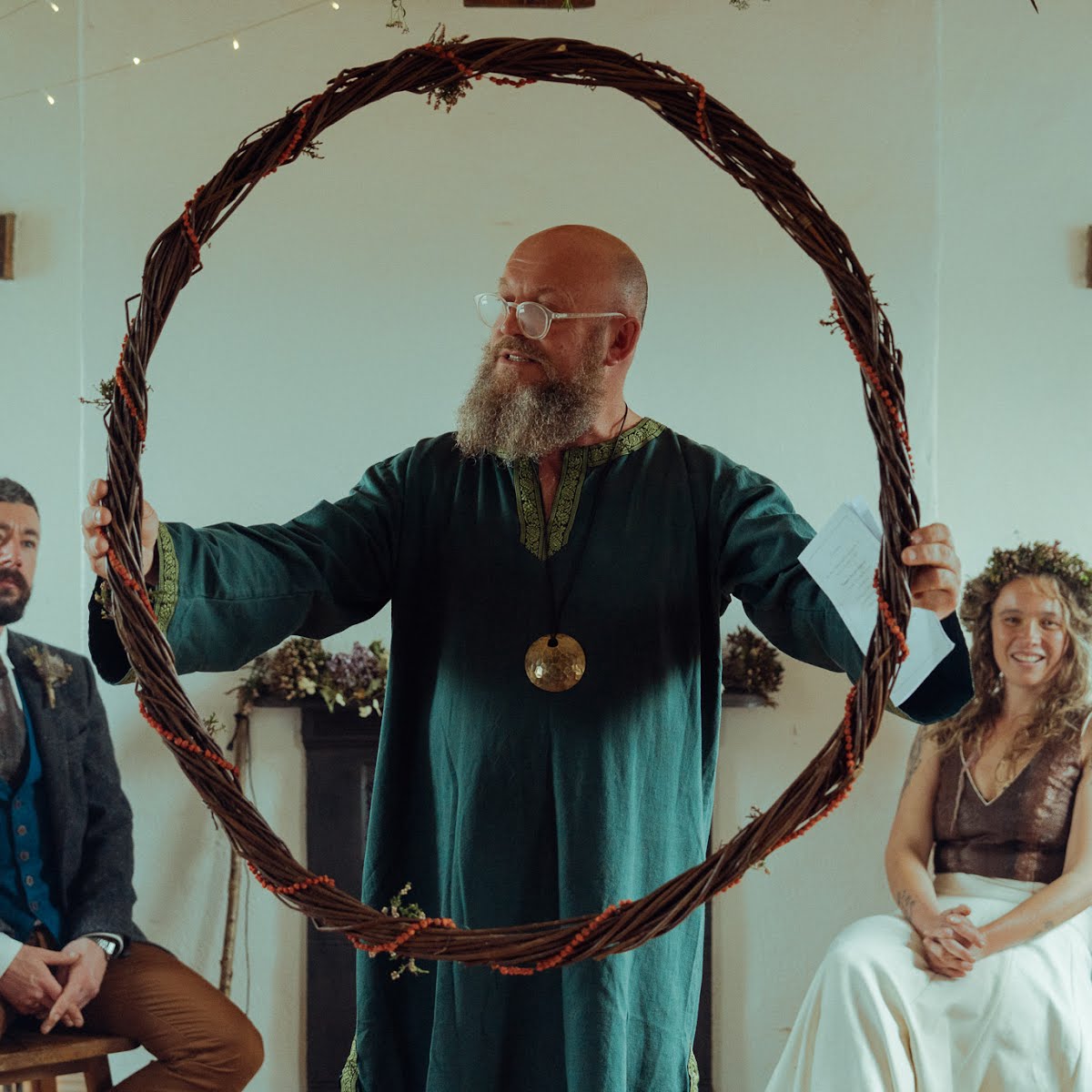 We chose not to have rings as part of our ceremony and instead wove a willow circle, decorated with dried Rowan berries – a symbol of protection. We stepped into the circle to read our vows and this was lifted above our heads as a powerful moment of blessing and protection.