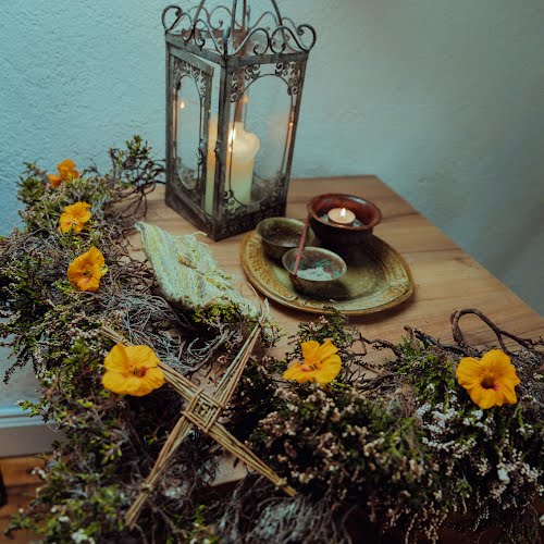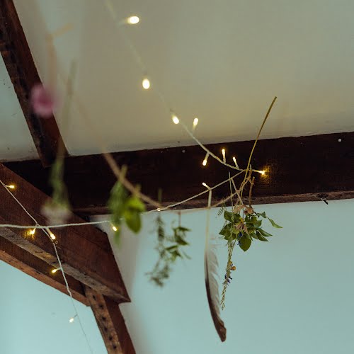 Willow decorations (stars, hearts, wreaths) were woven by me, Matt and our families. Other dried wild medicinal plants such as mugwort, yarrow and meadowsweet were arranged around the room. Also, deer antlers were used liberally as I adore deer.
