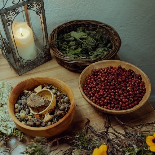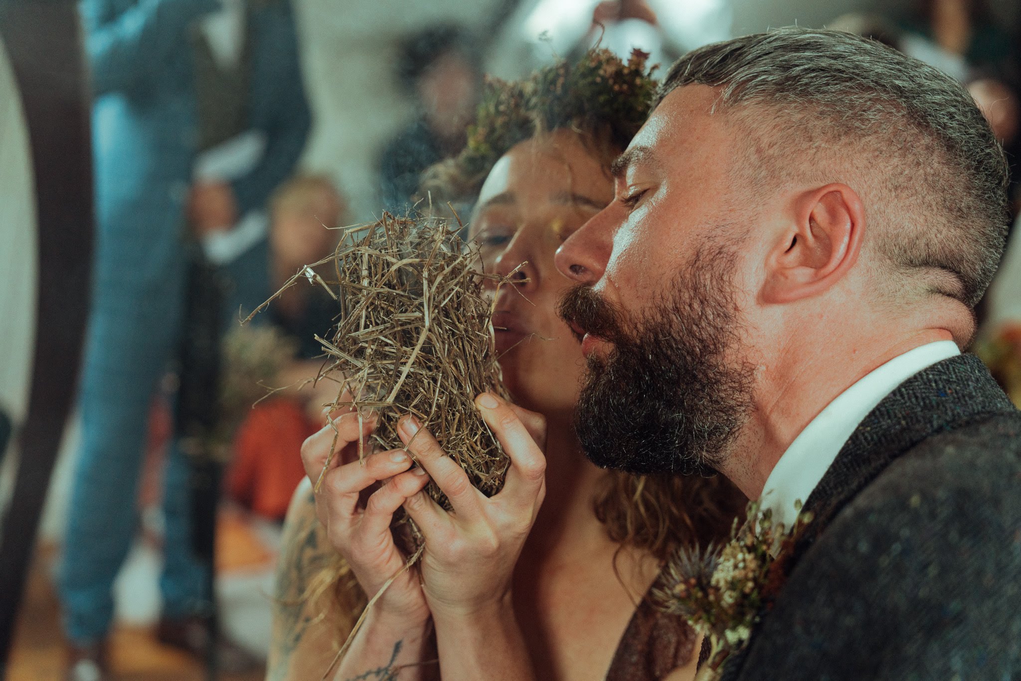 Fire is an important part of our life so we decided to kindle a fire as part of the ceremony. This was done by rubbing sticks together. Creating fire in this way symbolised the mutual effort needed by each of us to continue to tend to the flame of our relationship. We included significant natural allies in the offerings; nettle to welcome challenge, hawthorn for heart, water for joy, and hazelnuts for wisdom.