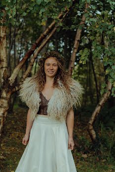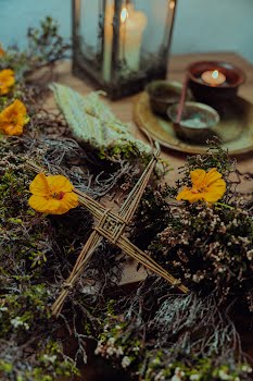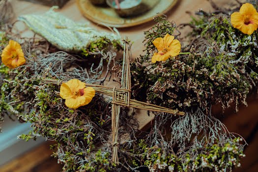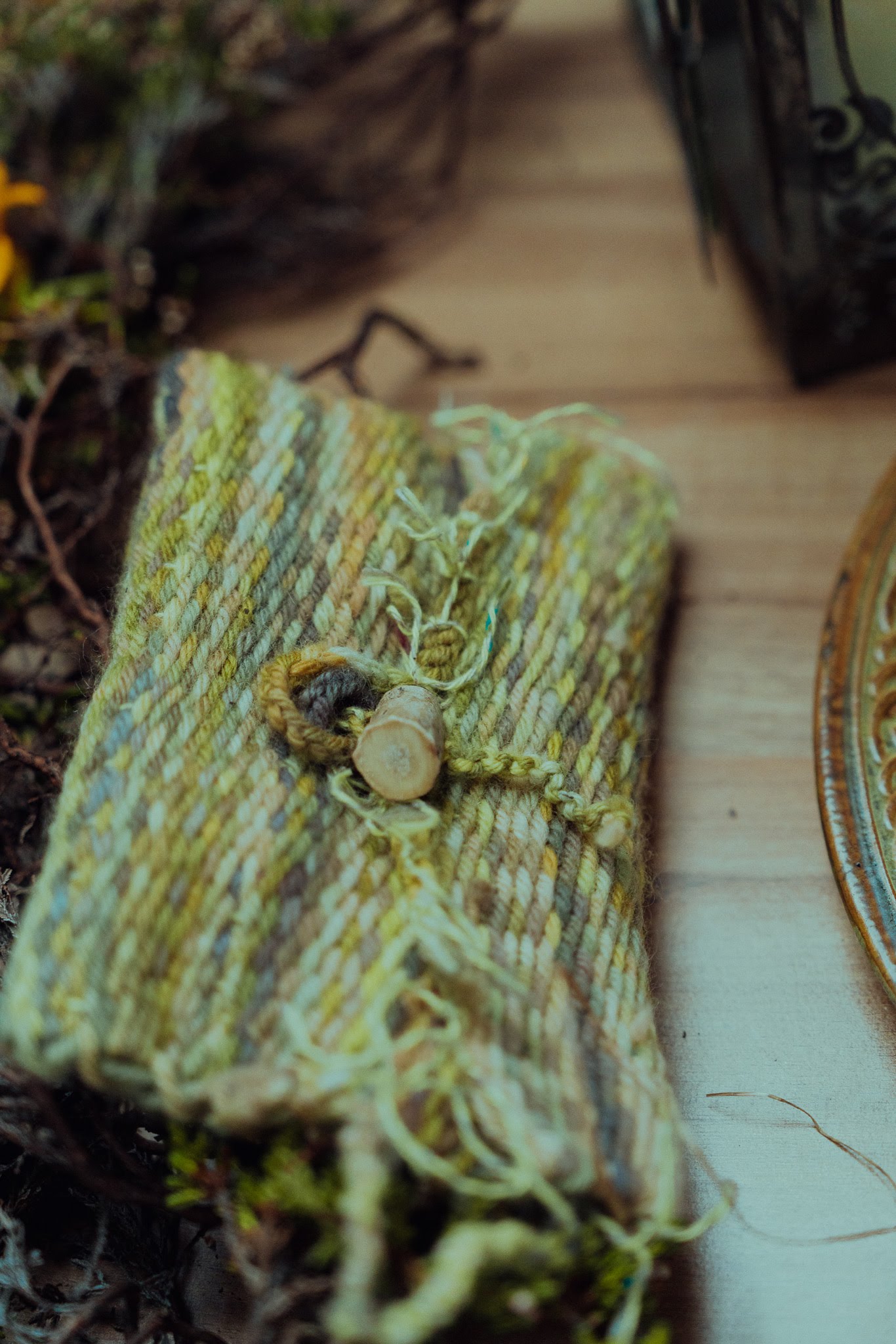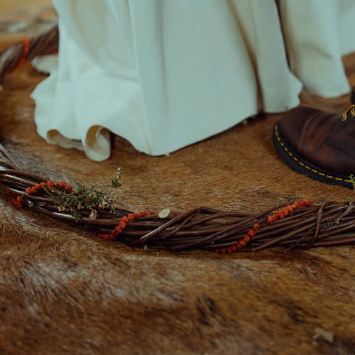 We used a traditional críos for the handfasting. The wool was naturally dyed by myself with nettle, dyers polypore mushroom, blackberry and lungwort lichen – all gathered locally. The críos was then woven by a local weaver, Léila Worth.