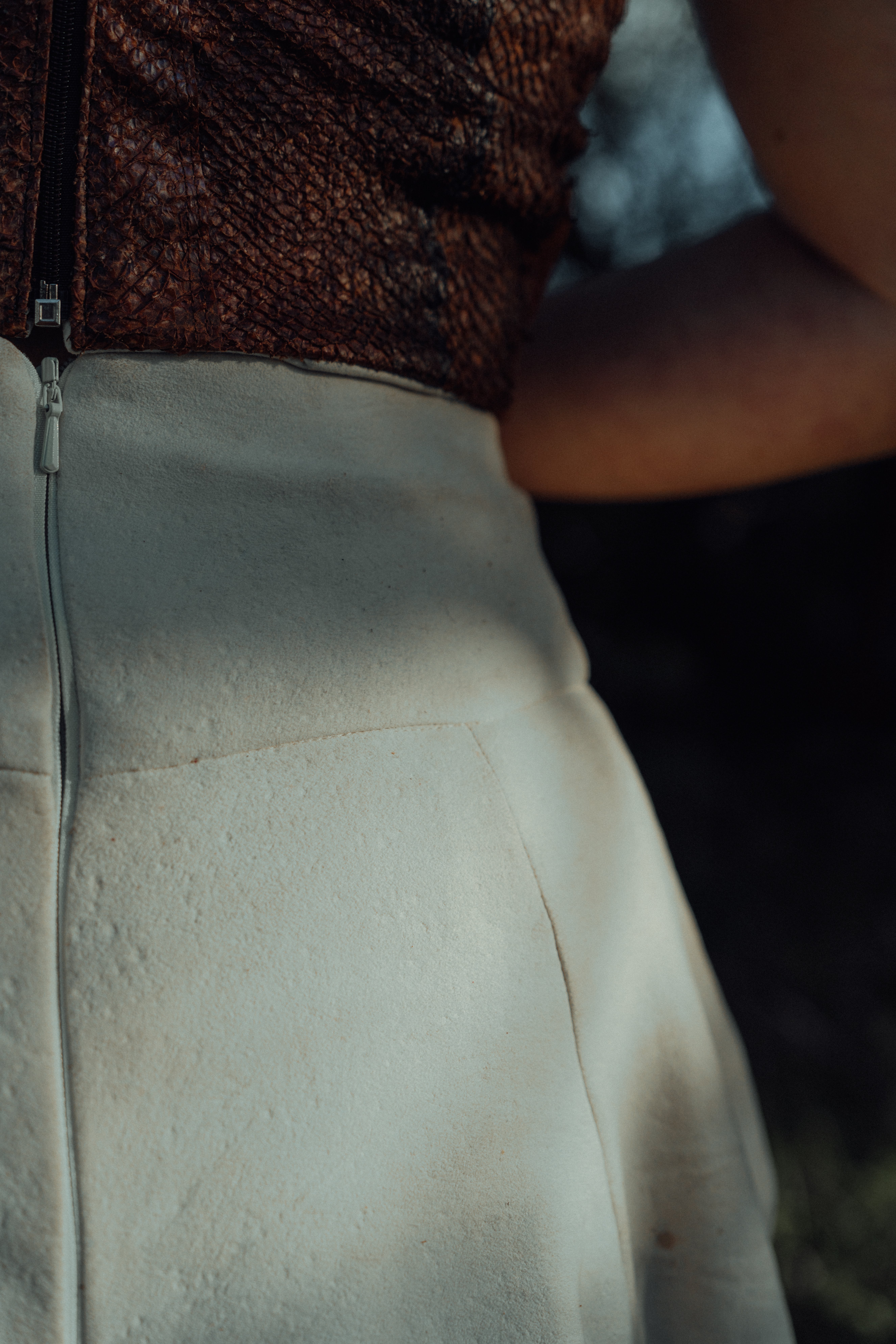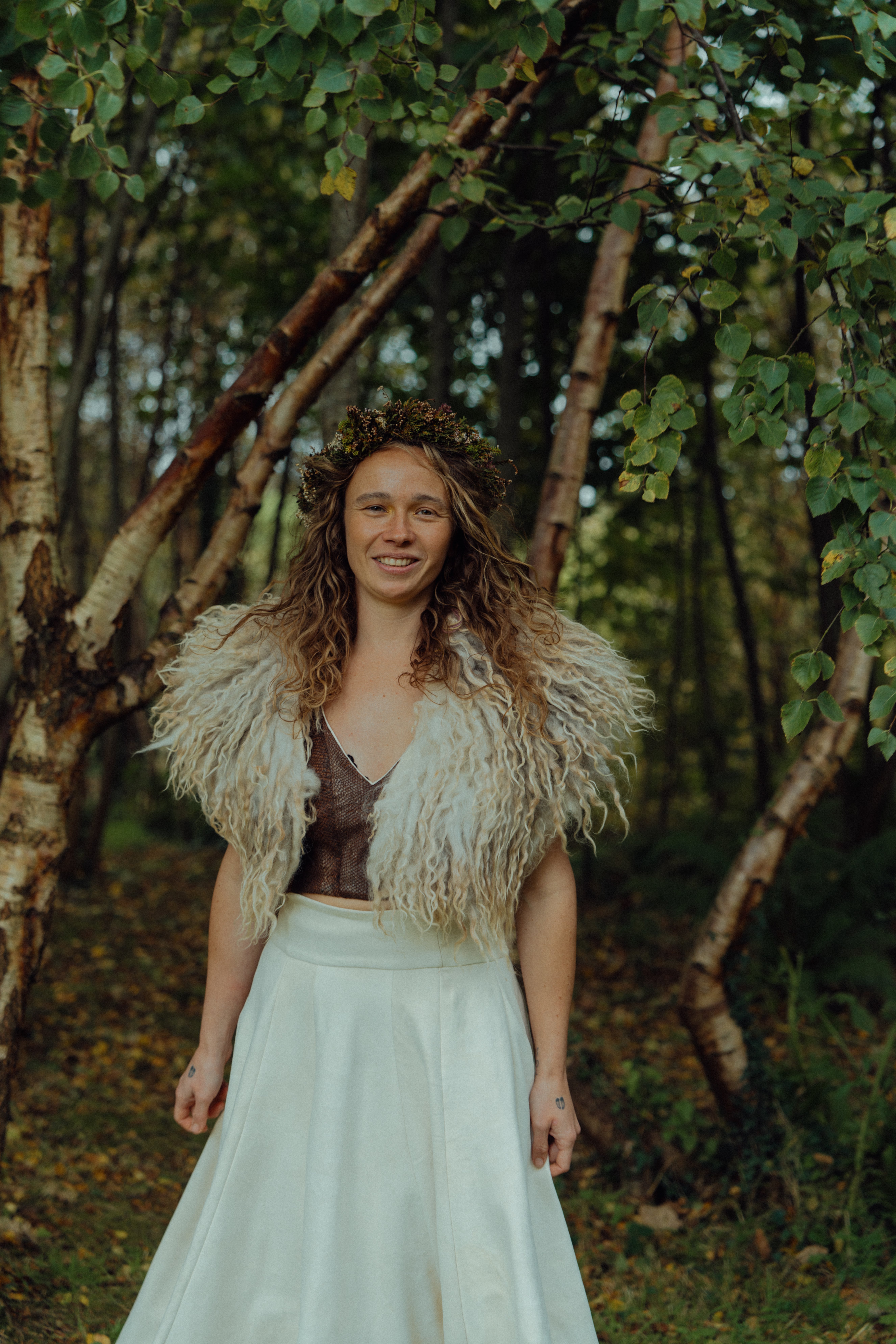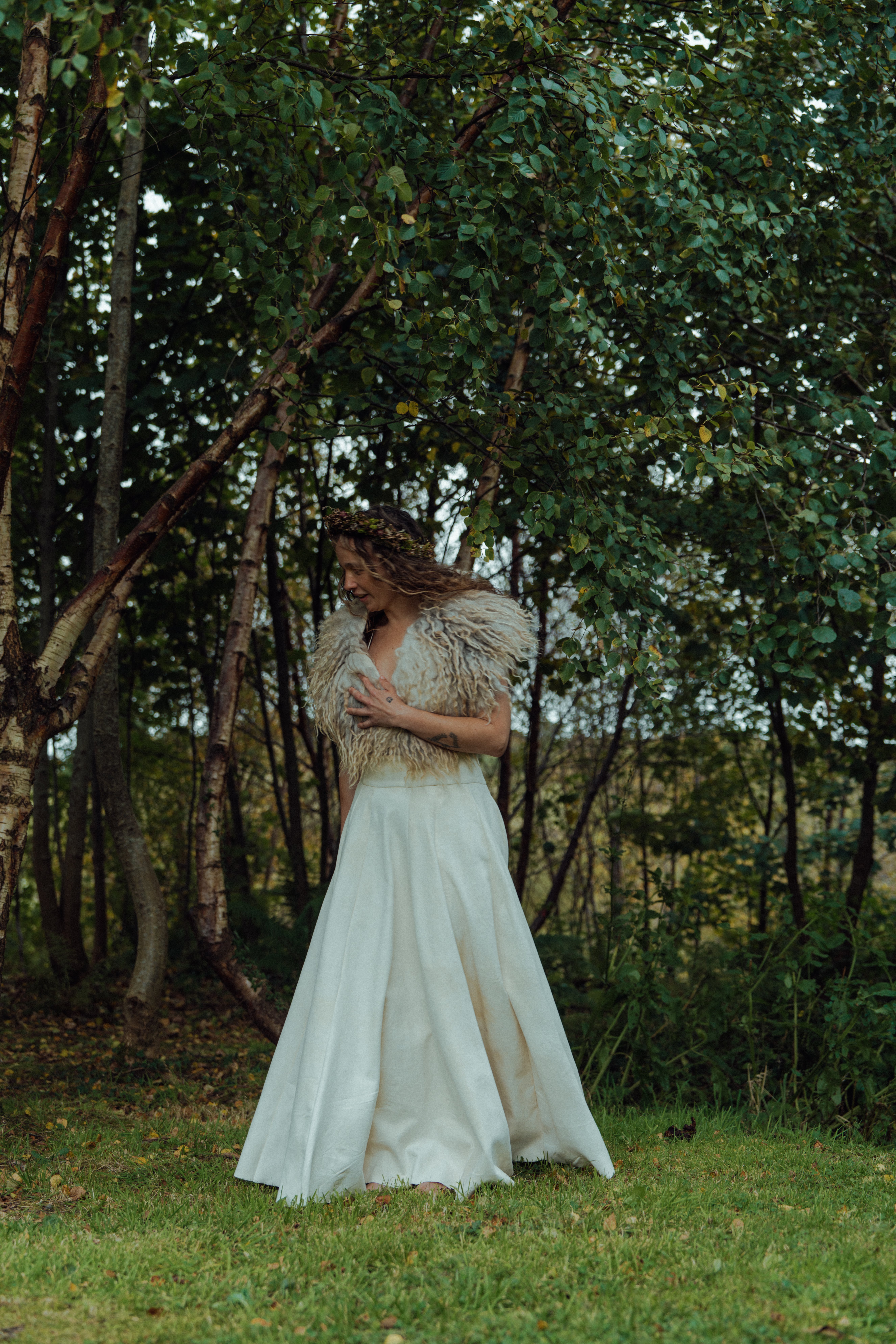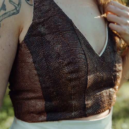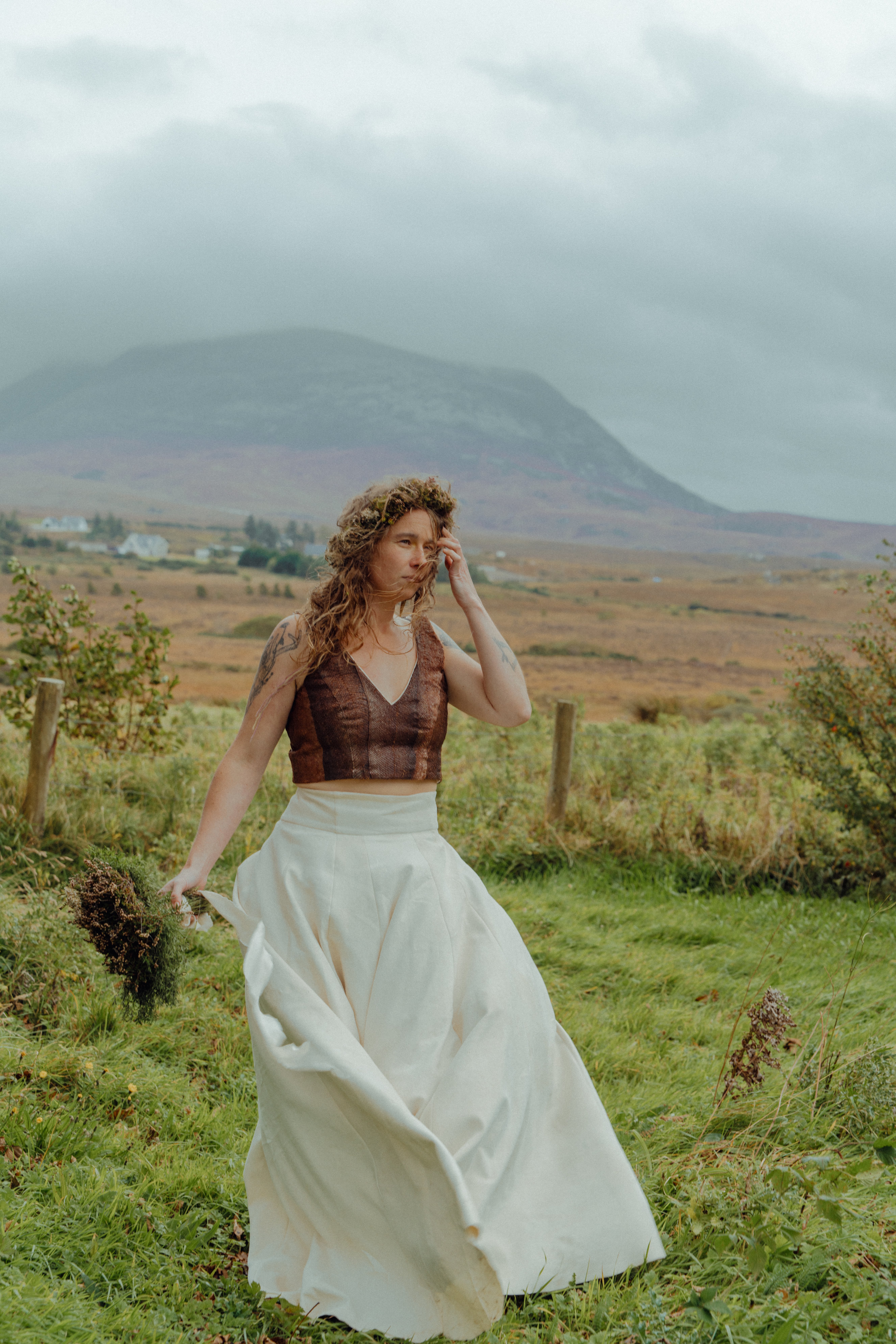 My top was made from salmon skins gifted by a friend who caught the salmons locally in Donegal. Tanned by myself (Lucy) with willow bark. Softened by many friends around many fires. Designed and sewn by Jacinta of Purple Peach. The skirt was made of eleven reindeer skins that were sourced by Ulu Tannery, Norway, who works with local reindeer herders and salvages the skins. They were traditionally tanned in ceremony over seven days by myself and traditional tanner Jessie Watson-Brown of Oak & Smoke Tannery. We travelled to Norway to tan the skins high up in the mountains where the reindeer live. It was then designed and sewn by Jacinta Caraher of Purple Peach.