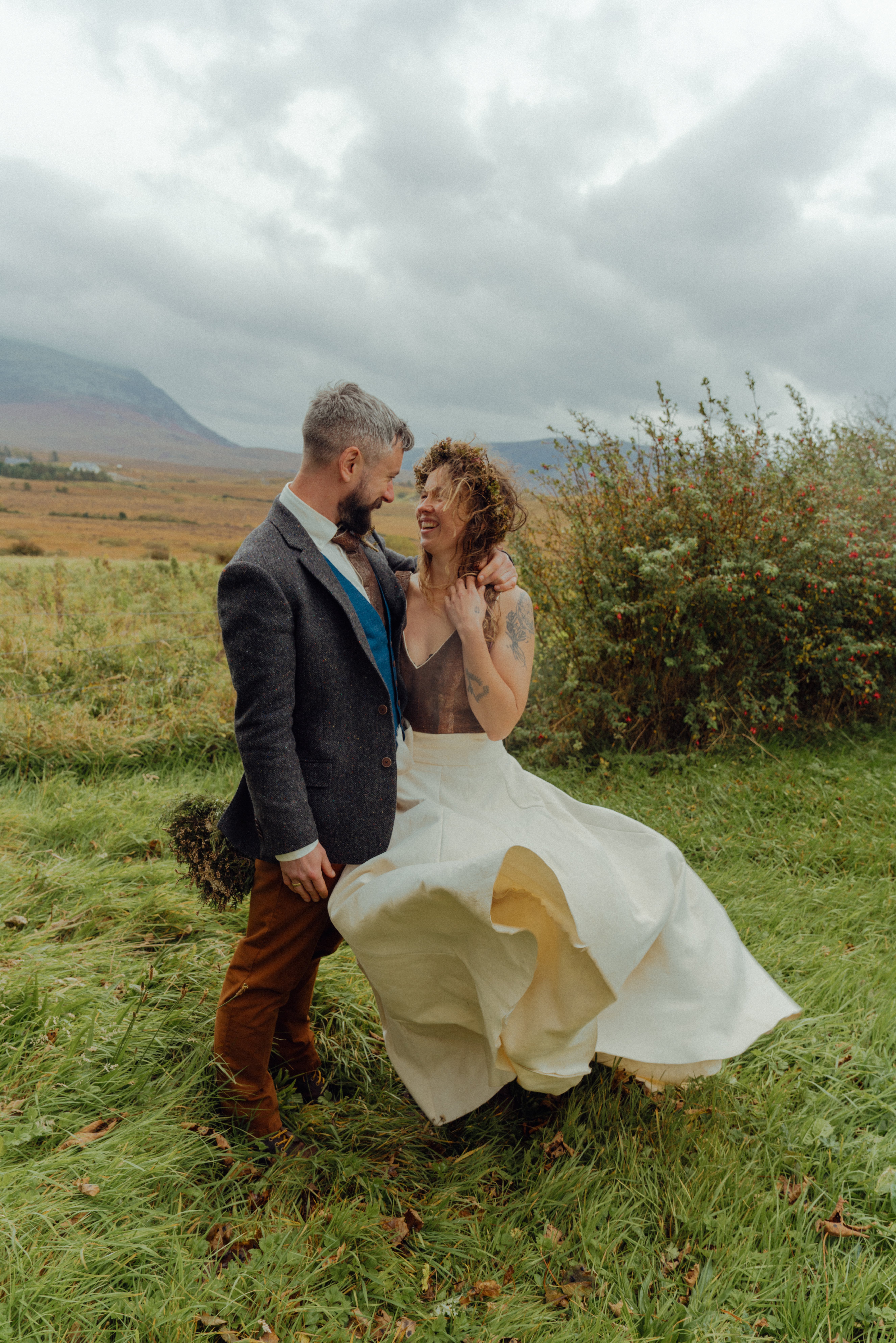 Matt’s family are very musical. As I walked down the aisle, his cousin Oonagh sang “Lagan Love” accompanied by his mother Eithne on harp and our friend Joe on flute. Other musical elements in the ceremony were included by Matt’s best friend Páidí Ó Dubháin, who sang “Gleannta Glas Gaoth Dobhair”. Matt’s friends (who he toured with in George Ezra’s band) and his brother and nephews also played “Sexual Healing” with drums, brass and bass as we danced back down the aisle.