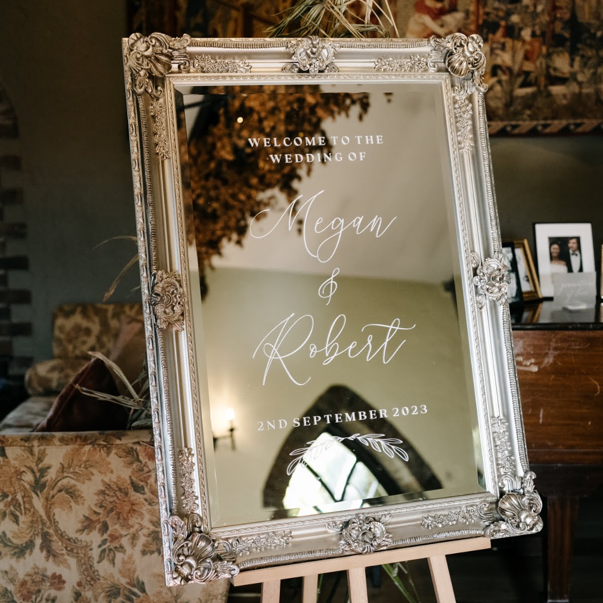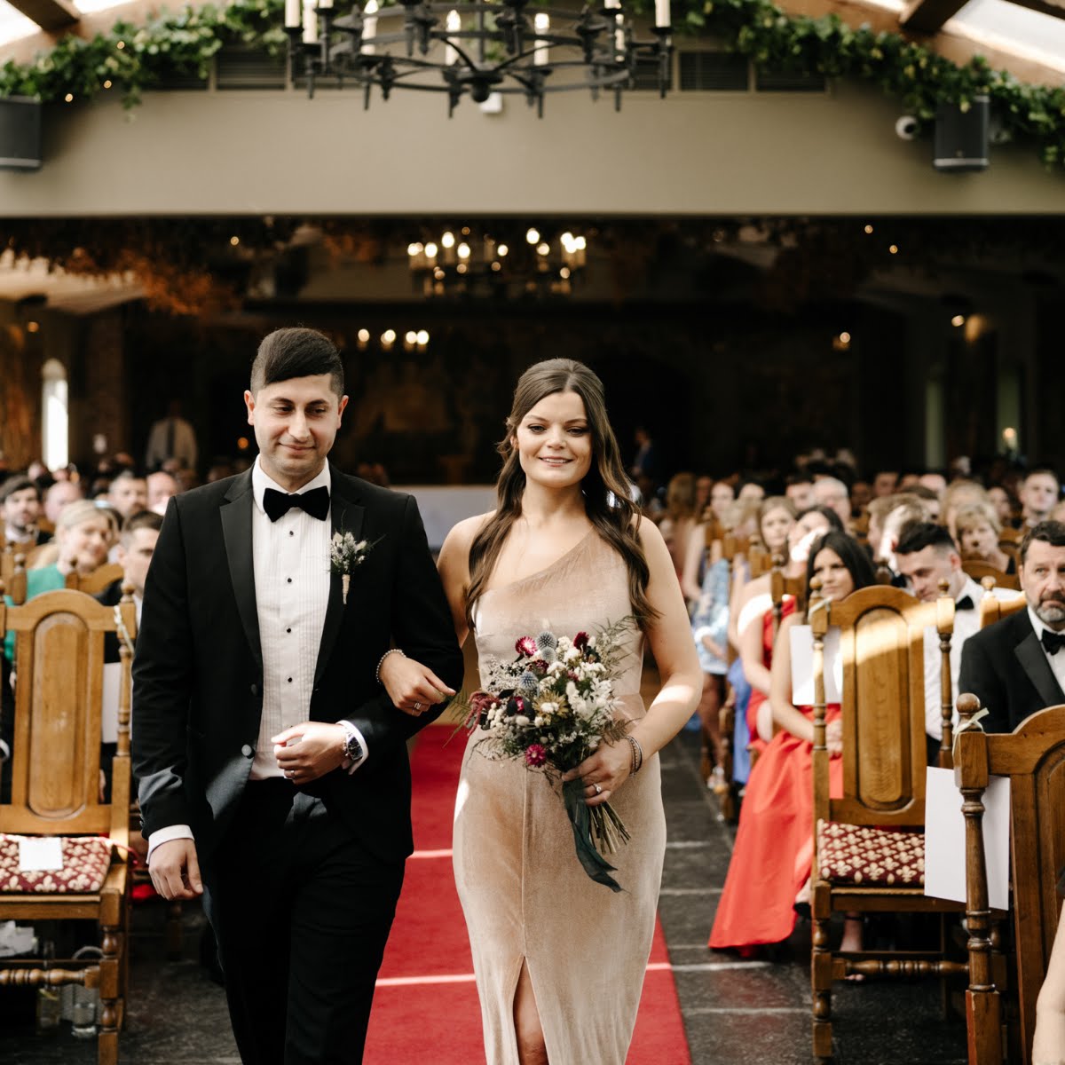 From fonts to colours, I had the most fun synchronising everything to match the style we were going for. I have a background in graphic communications so it was a lot of fun to put our personal stamp on things like printed stationery and signage throughout the venue. We paired the medieval vibes of Barberstown Castle with a whimsical style – dried flowers (from Meadow Bunch), champagne-coloured velvet dresses for the bridesmaids and pops of deep olive green as the secondary colour – mainly featured in the stationery on the day. My employer generously printed our programs and table numbers for us. I designed everything (with the help of Canva), from the invitations and programs to the table numbers and the seating chart.