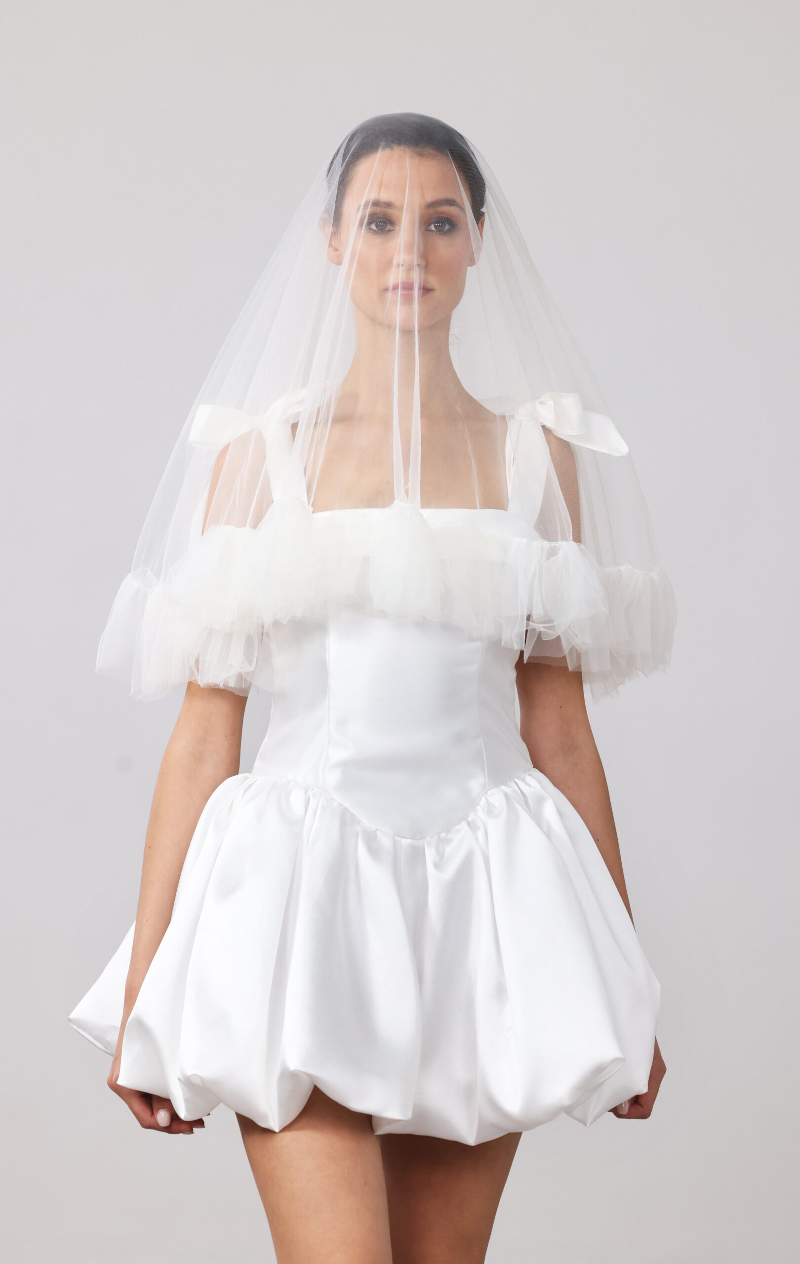 Making my own wedding dress inspired me to make all my bridal outfits in the lead up to the wedding, and then to launch a mini bridal collection. A big dress would have held me back from dancing the night away, so a mini dress was a better option. I added layers of tulle and bows to the skirt to make it ballerina-like, extra playful and full of movement.