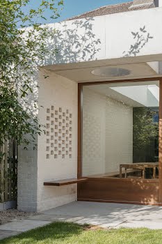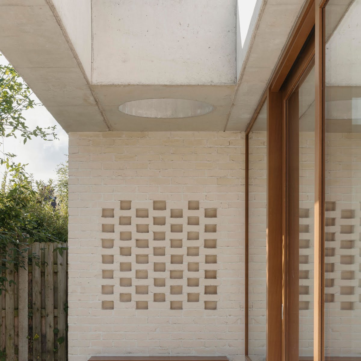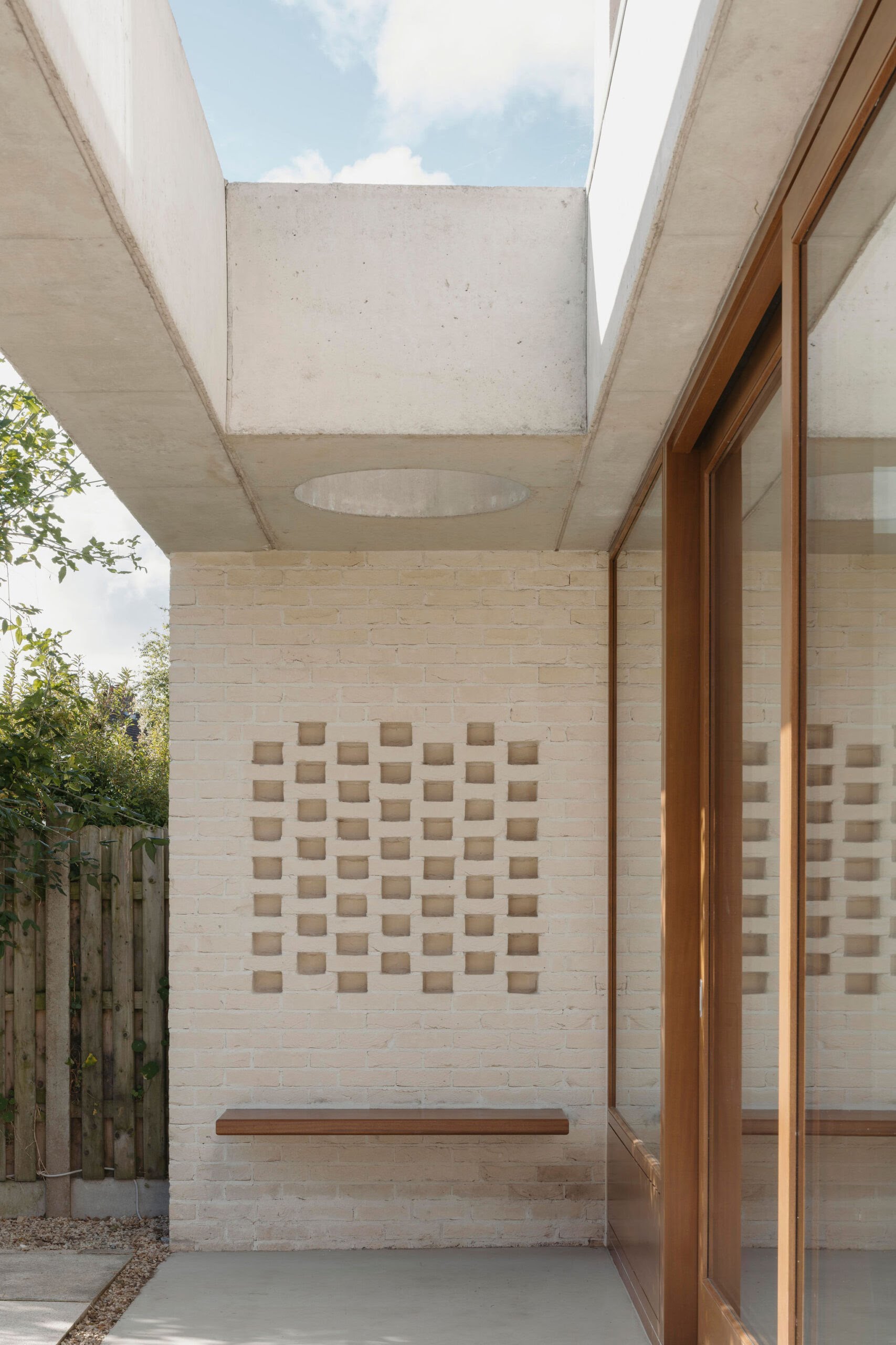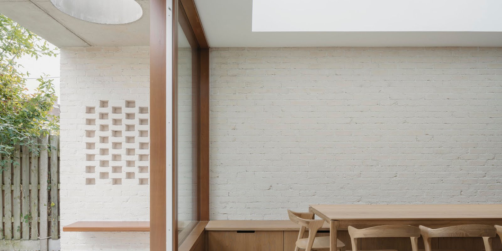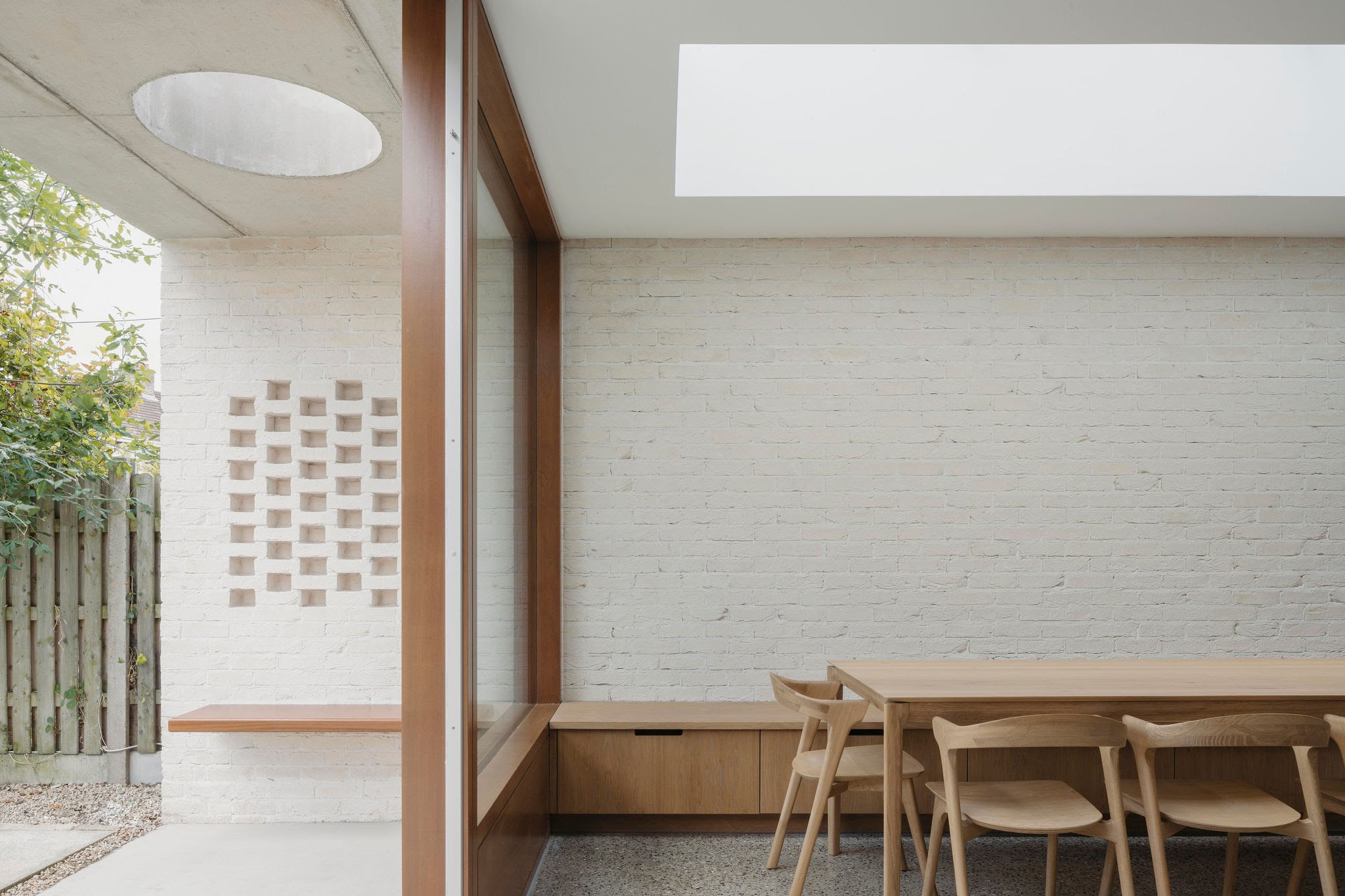 “The brick to the rear reflects the brick to the front of the house, even if it is very different in application and colour. This change in tone ensured a neutral textured backdrop for the small garden, which could easily have been overpowered by a stronger coloured brick. The brick piers also screen the functional side passage to the utility room, integrating the division of the garden into the design.”