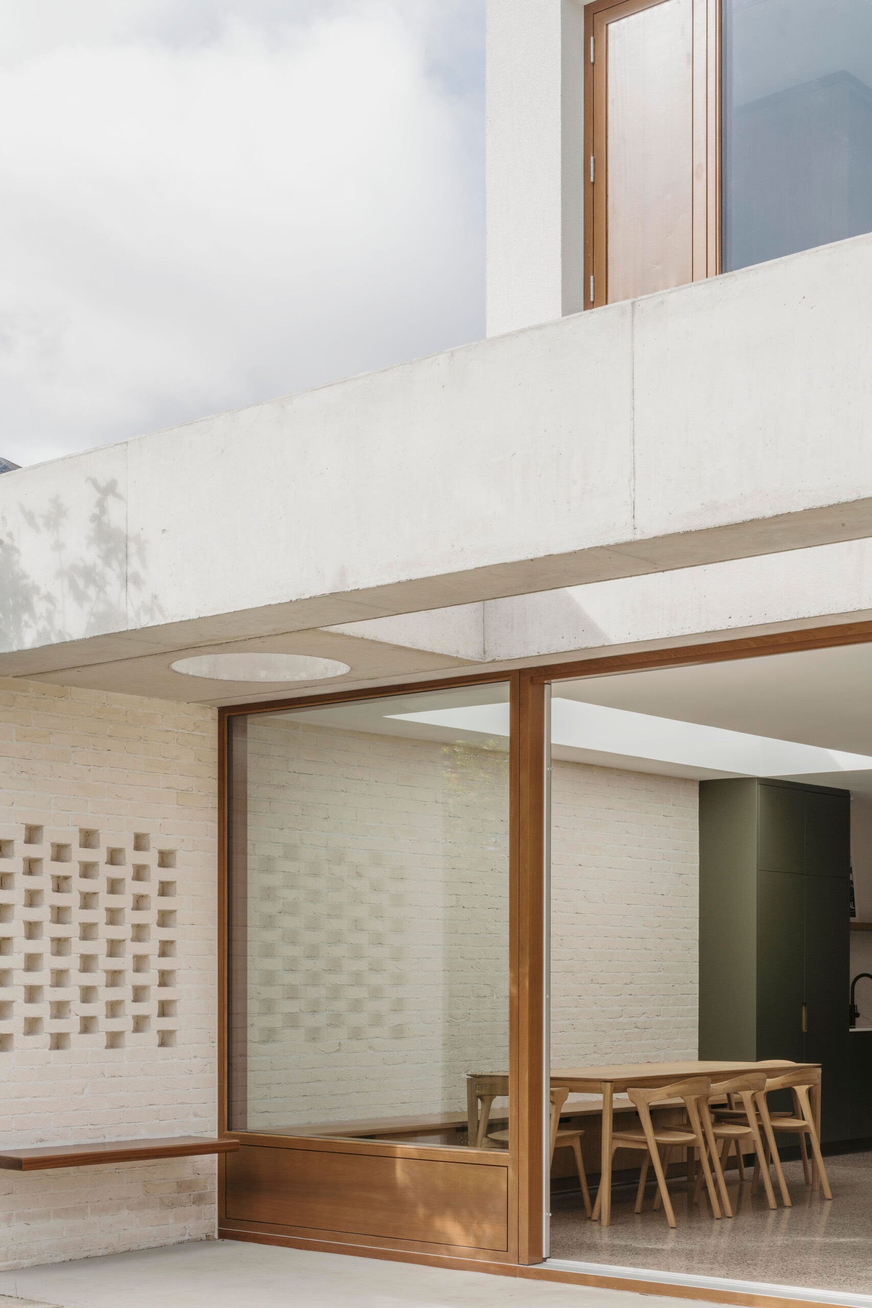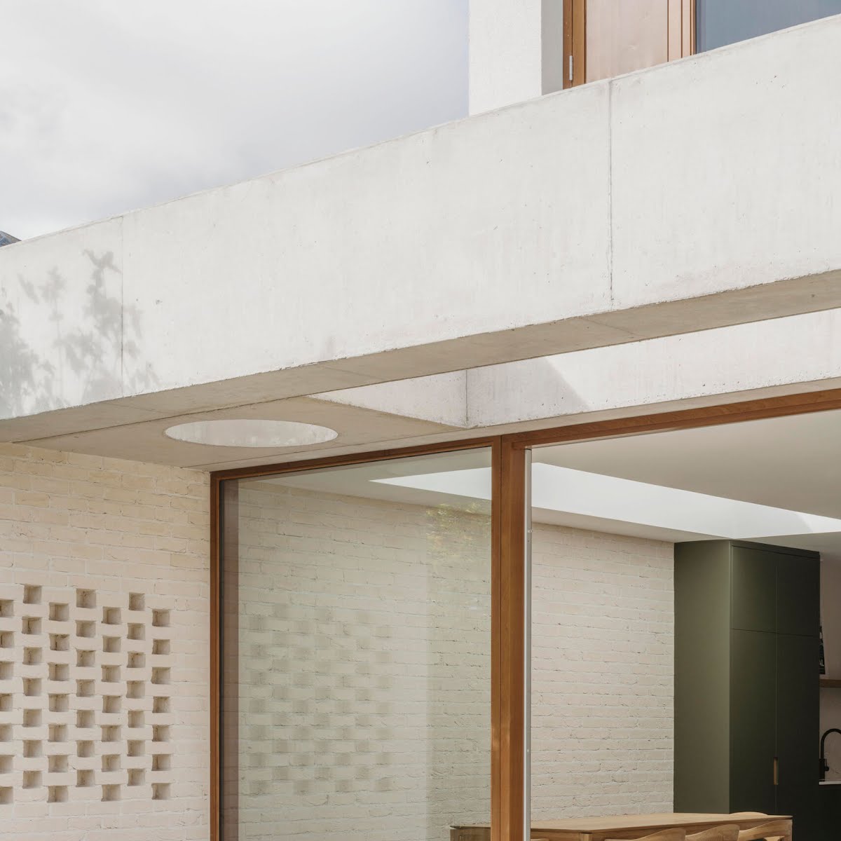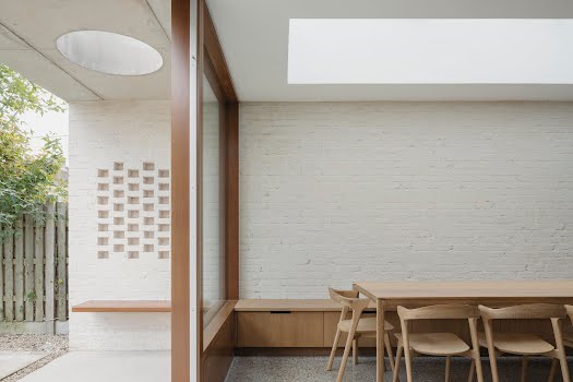 “At ground floor, the concrete canopy overhead creates a transitional space between the new open plan living area and the existing garden. Circular and rectangular punctures through the thick canopy give a sense of depth and create a play on shadow and light that changes throughout the day, further reinforced by the hit and miss brickwork detailing. The simple palette of brick and concrete is complemented by carefully considered timber joinery, hardwood timber windows and a polished concrete floor, with a pop of colour in the tall kitchen units.”