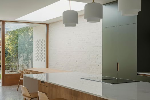 “By maintaining the connection between the front room and the new space to the rear we let the evening light continue to flow through the house. A long rooflight over the dining area catches direct sunlight from morning to the afternoon, washing the brick in lovely light, even when the sun doesn’t shine. The concrete canopy at the rear creates a transitional space between the new open plan living area and the existing garden but by creating openings in it, we still allow morning light to flow through while maintaining that feeling of threshold between the living space and the garden.”